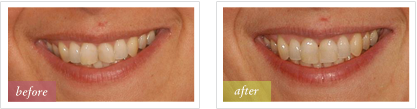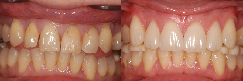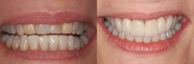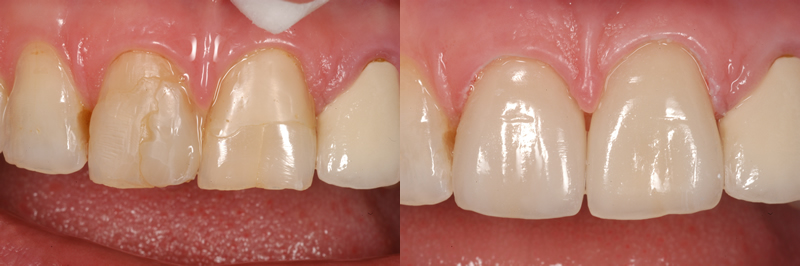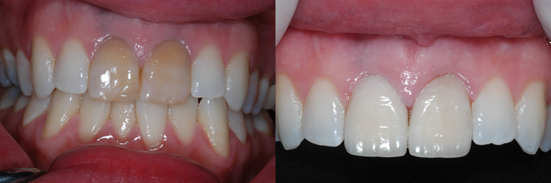 A 50 year old male had several large fillings on his front teeth over many years. The white fillings were now failing, and the colour match was difficult and he preferred something more permanent. The treatment was to make 2 porcelain veneers. This improved not only the strength, but the colour of the teeth.
