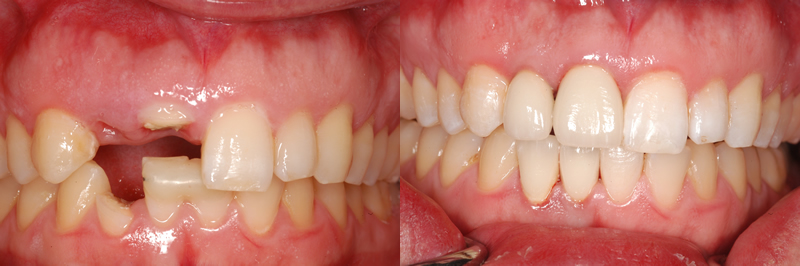 A 25 year old man had a sporting accident, which destroyed his prefect smile. We had to replace the knocked out teeth using implants and crowns. He now wears a gum shield for all sporting activities.