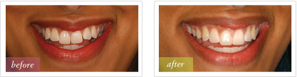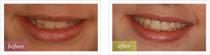A 27 year old lady had an accident as a child. This resulted in her two front teeth 'dying' causing them to discolour over the years. The colour was progressively getting darker making the lady more and more conscious of her smile. Two dental veneers were made to cover her front teeth and mask their dark colour. Her confidence improved enormously.