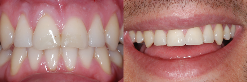 A 30 year old male pilot had an accident and fractured his two front teeth. They were repaired with white fillings, the colour match was difficult and he preferred something more permanent. The treatment was to make a small sectional porcelain veneer. This saves cutting the tooth down and produces a long term excellent result.