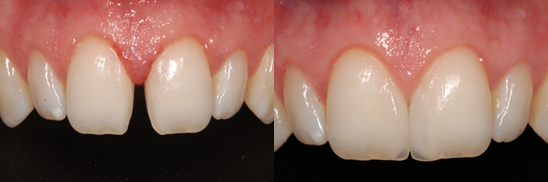 A 26 year old lady had treatment at another practice to replace close a gap between her 2 front teeth. A common issue for a lot of people. The treatment was done with fillings which gave her one wide tooth and the other narrow. We removed her fillings to reveal her gap. It was decided to make two small sectional veneers to close the gap. She was delighted with the result.
